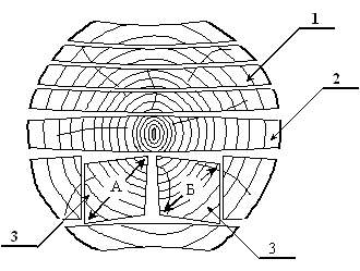 1 : распил на ложную четверть, максимальная тангенциальная усадка